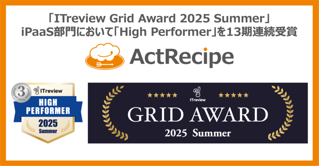 iPaaS「ActRecipe」が「ITreview Grid Award 2025 Summer」において「High Performer」を13期連続受賞